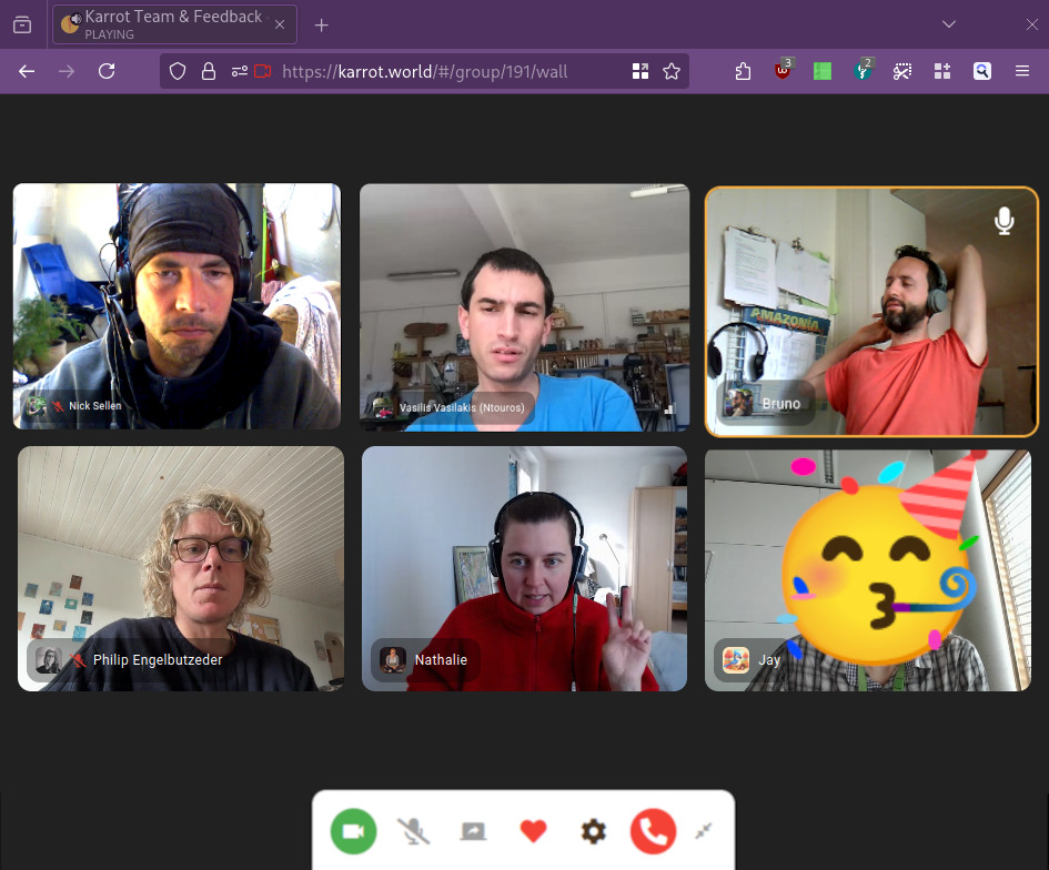 Alt: _Screenshot of an online Karrot meeting. There are 6 people in the call._